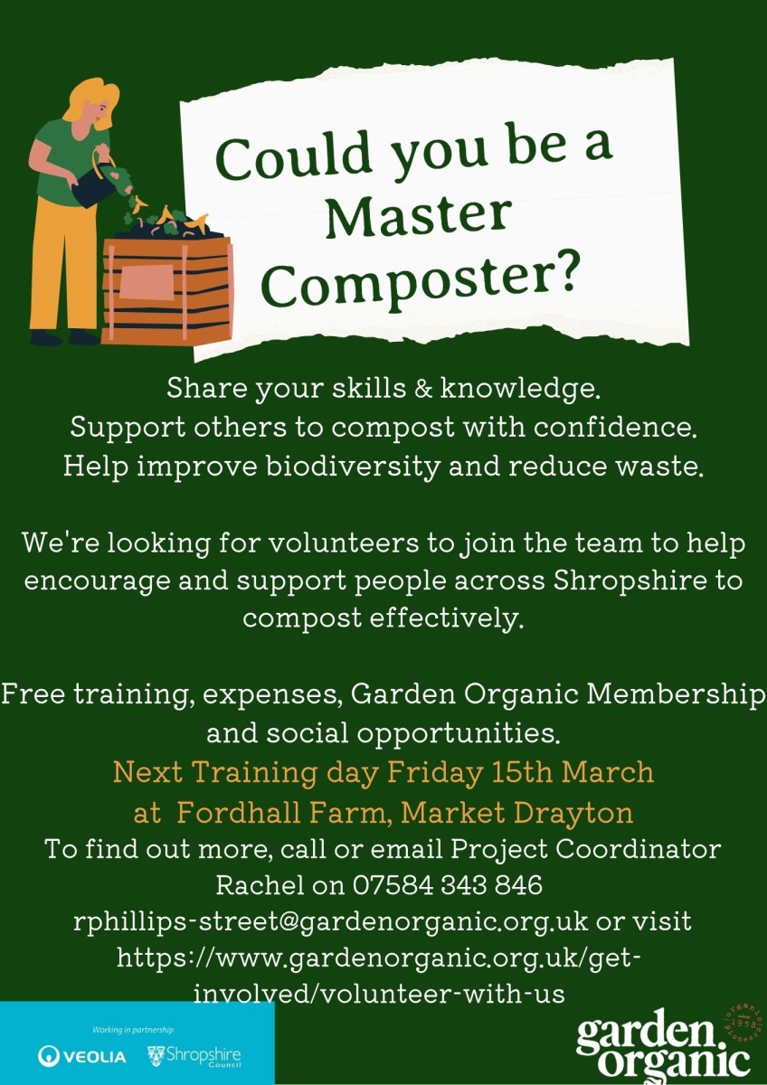 Shropshire Master Composter Recruitment: We're very excited to be holding our next volunteer recruitment and training day at Fordhall Organic Farm in March. If you'd like to join our team of composting enthusiasts, a wonderful group of volunteers who help people to compost effectively in Shropshire, please get in touch with Project Coordinator rphillips-street@gardenorganic.org.uk . We're looking for people who can volunteer a few hours of their time regularly to promote home composting. There are lots of ways you can get involved, from attending events, helping in community gardens, giving talks, supporting schools, writing and sharing composting info online, or just having a chat with your neighbours about what amazing stuff compost is. No experience necessary, just enthusiasm and a love of composting. Our training will give you the confidence to help other to people compost effectively. See poster for details and please get in touch for more information or to book a place at our training day. See poster attached. Plastics in Soil Project with CAWR Garden Organic would like to invite you to take part in a project with Coventry University’s Centre for Agroecology, Water and Resilience (CAWR) which will explore the levels of plastic in our soils, the impact this is having, and ways to reduce plastic contamination in the garden. You can find out more about the project here: Take part in new research on plastic pollution | Garden Organic Dr Francis Ryan from Coventry University will lead the 6-month project, and we would like to invite you to an initial workshop in Shrewsbury, where Francis will explain the project in further details, exploring the issues of plastic contamination in the garden, and how you can help be part of a larger body of research, gathering evidence from your garden or growing space. We are looking for keen gardeners with gardens of any size to get involved. Venue: The Bradbury Room, Drapers Place in Shrewsbury (Horsefair, Abbey Foregate, Shrewsbury, SY2 6BP) Drapers Place | Shrewsbury Drapers Company Date: Thursday 22nd of February from 3.30-5.30pm. Refreshments will be provided. There is no parking on site, however the large, long stay car park behind the Shropshire Wildlife Trust, off Abbey Foregate, is less than 5 minutes’ walk away. We will be able to reimburse parking and travel costs. Please email me to confirm your place rphillips-street@gardenorganic.org.uk or if you have any questions. If you know of any other keen gardeners or groups who would like to get involved, feel free to share this information with them. Booking is essential due to the venue capacity. It would be great to get a good group of us from across the county to explore the issue further – really hope you can make it!