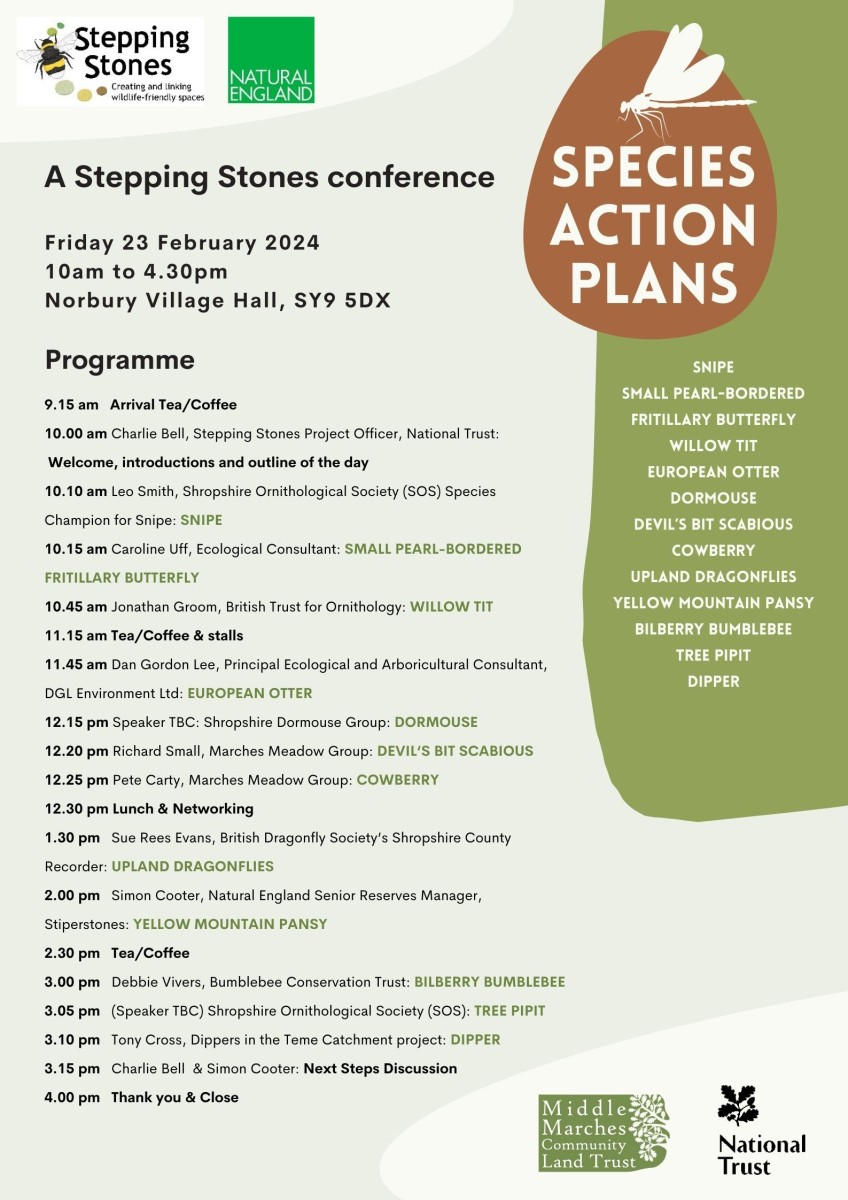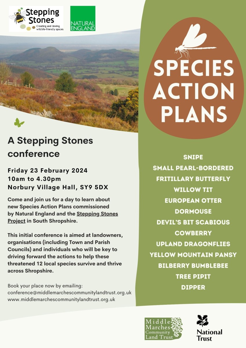 A Stepping Stones Conference - SPECIES ACTION PLANS Friday 23rd February, 10am - 4.30pm, Norbury Village Hall Book now on conference@middlemarchescommunitylandtrust.org.uk